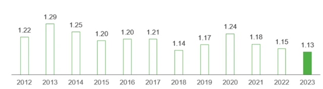 Total specific energy consumption in MWh/t of copper products sold is decreasing.